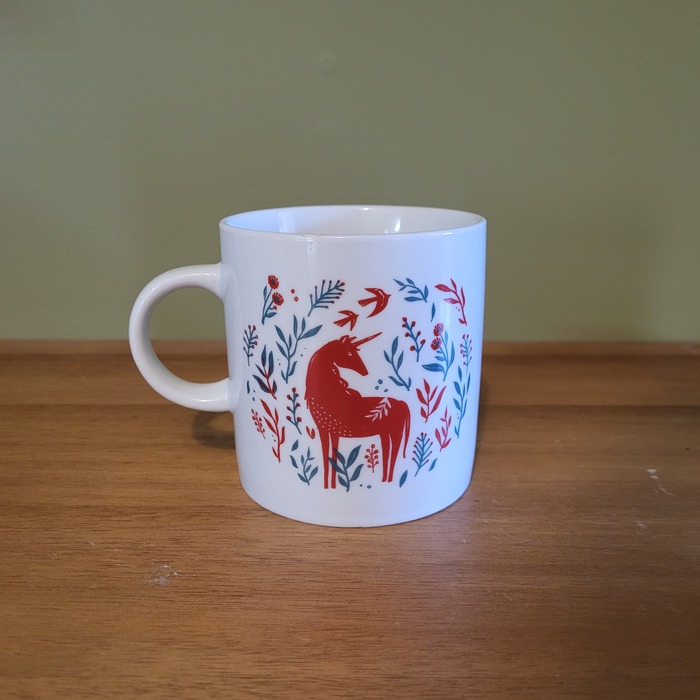 I try to be careful with this one. It has a few cracks inside which then got coffee/tea stained. I should've taken a picture of the other side too, it's a green hippogriff. I'm not really sure where I got this but its the perfect size for hot or cold drinks.