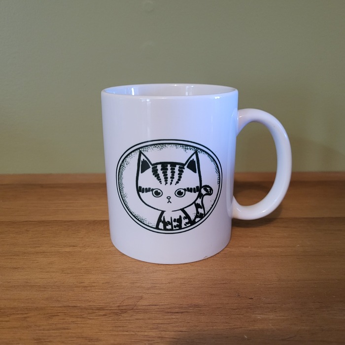 It's silly but I like to make replicas of small things from movies or TV. This one is from Scott Pilgrim vs. the World (2010). This mug only shows up for a few seconds but I really liked it so I found a version of the original sketch which I then edited to try to color match as best as I could and got it printed somewhere. I use this one a lot and I keep the files just in case something happens to it and I need to reprint it.